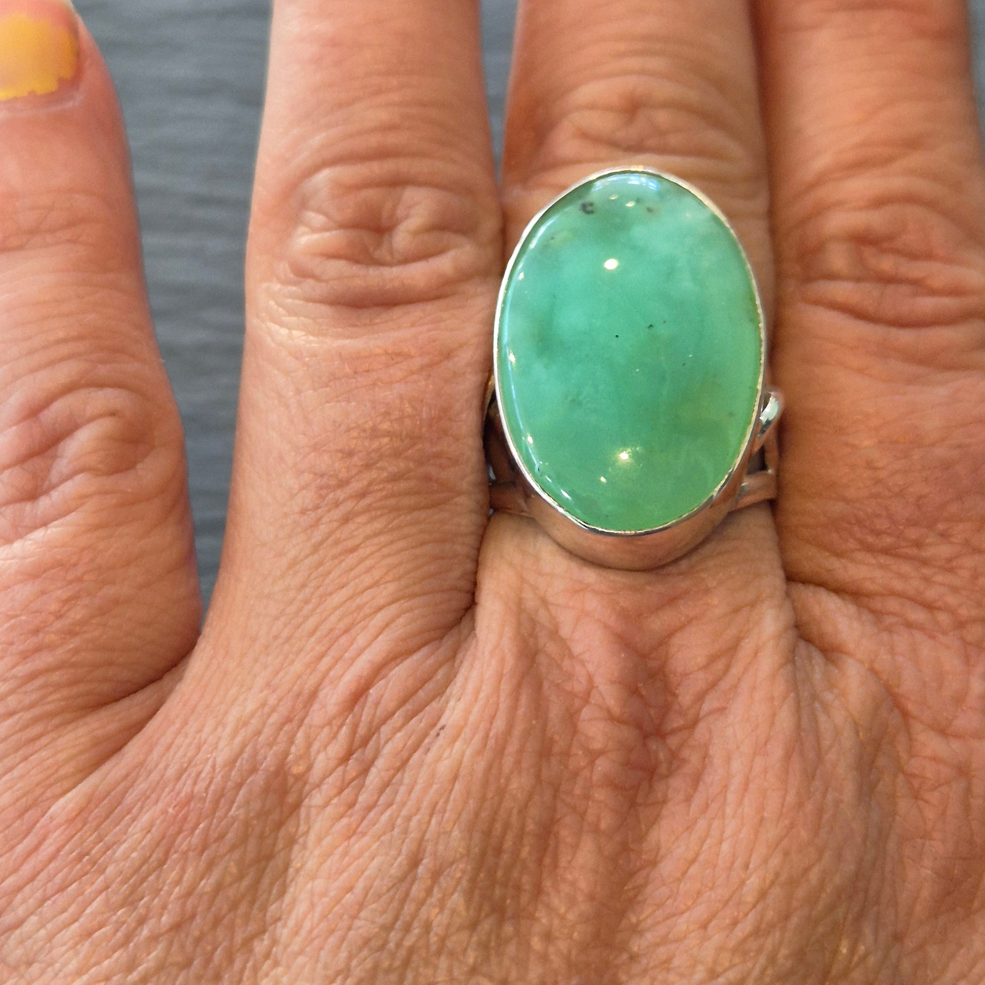 Ring: Chrysoprase set in silver 925 with a latticed band.