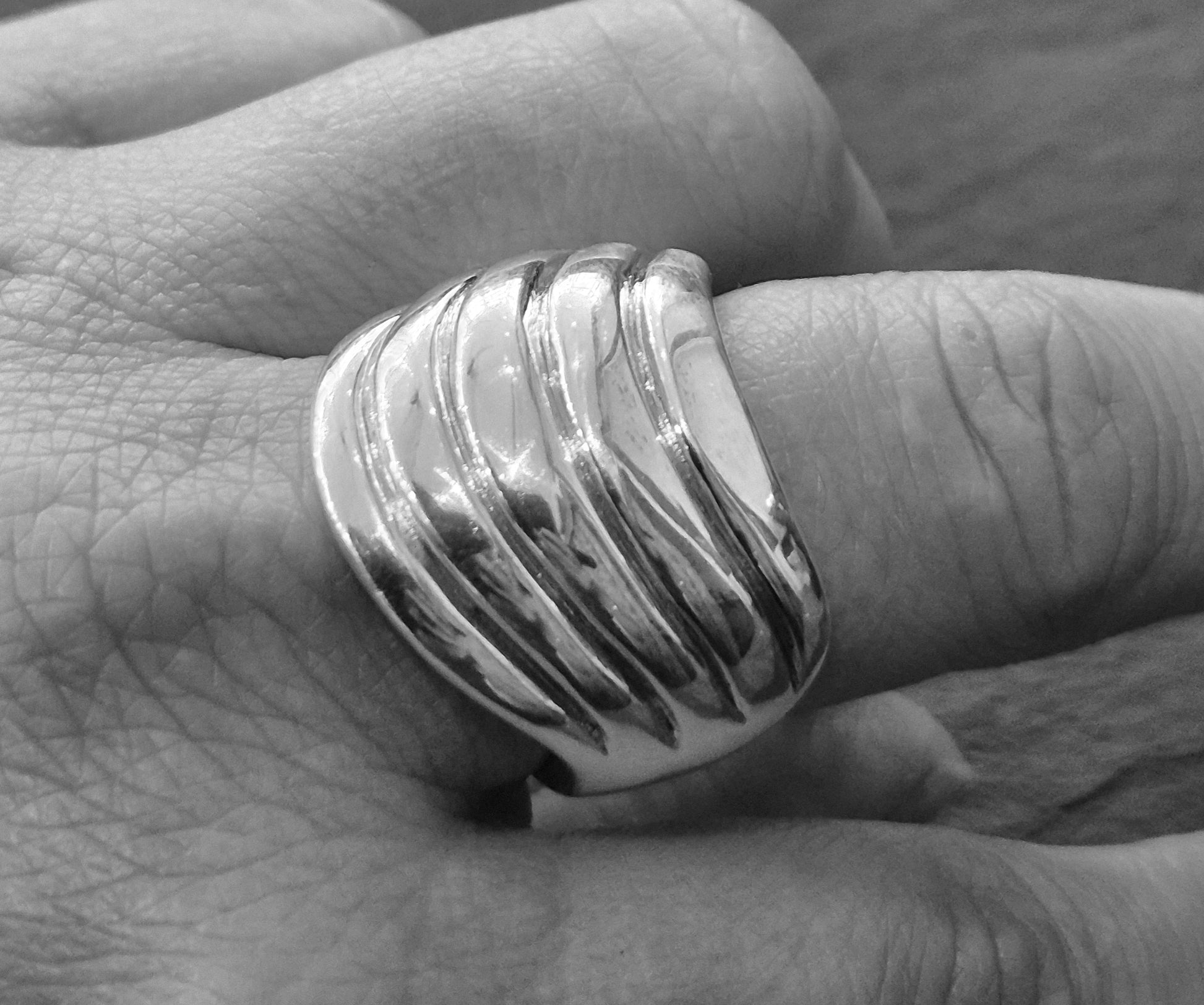 Ring: silver 925. Chunky silver ring with wave form design, this ring is made hollow and so remains light weight.