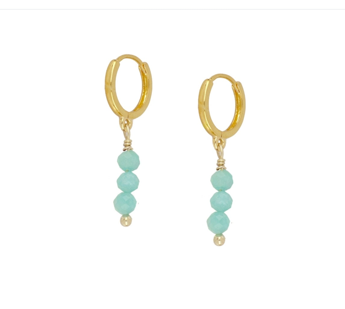 Add an element of fun with these pop of colour natural stone earrings, on a click hoop. The stone is amazonite.